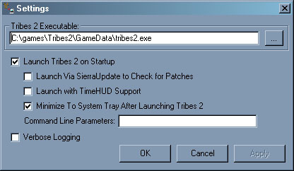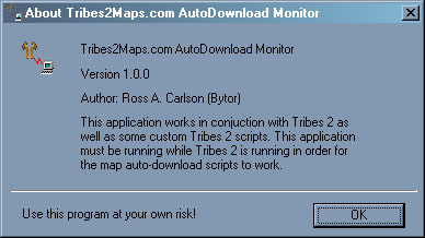 RUNNING THE PROGRAM: By default, Tribes 2 will be launched automatically once you start the AutoDownload system. You can change this behavior by modifying the settings in the program. You can also elect to have Tribes 2 launched via TimeHUD.exe if you use Panama Jack's script package. The installation program will automatically detect if TimeHUD.exe is installed, and preset the program settings to launch T2 via TimeHUD.exe if it is found. Within Tribes 2, if you attempt to join a server that is running a client-side map which you do not have installed on your computer, the script will ask if you wish to download the map from www.Tribes2Maps.com. If you choose yes, the script will connect to the web site and download the map file, and then give you the option of reconnecting to the game server. If for some reason the map is not found in the Tribes2Maps.com database, then an error message will be shown and you will be taken back to the game server listing. Once you exit Tribes 2, the AutoDownload Monitor application (the Visual Basic program) will automatically exit. NOTE: You MUST have the AutoDownload Monitor application running in order for the system to work. Otherwise, downloaded maps cannot be prepared for use by T2, and the T2 script will just hang waiting for the map to be prepared, and it will eventually timeout and display an error. For this reason, it is a good idea to get into the habit of starting T2 by first launching the Monitor application and letting it launch T2 for you.